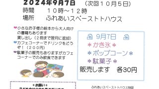 9/7に恒例となりました、トトふれあい文庫を開催いたします!かき氷ポップコーン駄菓子各種30円で販売いたします!また、カフェコーナーでドリンクなどの販売もございます本の貸し出しも実施していますのでお気軽に起こしくださいませ〜🎵